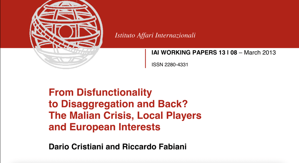 The Malian Crisis, Local Players and European Interests by my former Jamestown Foundation colleagues Dario Cristiani and Riccardo Fabiani. It was published in Rome by the venerable Istituto Affari Internazionali, an Italian think tank with a pro-EU, global outlook.